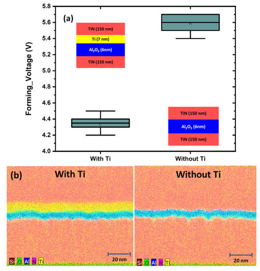 The single layer Al2O3−based MIM devices with and without Ti layer are (a) electrically characterized for their breakdown voltages (the inset images illustrate the schematic of the layer stack) and (b) material characterized by using cross-sectional TEM images with EDX elemental mapping.