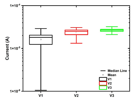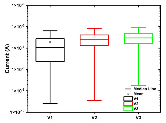 The variability in the LRS and HRS currents are analyzed with respect to the DC set operations. The values of the LRS and HRS currents of V1, V2 and V3 devices are extracted at a VD value of 0.2 V. The box plots of LRS and HRS currents illustrated in Figure 7 and Figure 8 are determined from 10 devices of each variant type. Figure 7 provides the summary of LRS currents distribution of all the three memristive device types. The mean values of the LRS currents increase with the thickness of the Al2O3 layers in the memristive stack. Furthermore, the addition of the Al2O3 layers reduces the variability of the LRS currents. The HRS currents extracted from 10 devices of V1, V2 and V3 devices are as shown in Figure 8. The mean values of the HRS currents increase with the thickness of the Al2O3 layers. The memory window (MW), which is essentially the on/off ratio of the memristive devices, is determined from the ratio of the LRS current values to the HRS current values. Both the LRS and HRS current values increase with the addition of the Al2O3 layers. As illustrated in Table 2, the mean values of the on/off ratios are determined to be, 86, 73, and 62 for V1, V2, and V3 devices, respectively. The increase in the LRS and HRS currents are discussed later in the same section, with respect to the QPC modeling. Although the values of the on/off ratios are reduced in V2 and V3 memristive devices, the variability in the on and off state currents of the resistive switching operations are also considerably reduced as shown in Figure 7 and Figure 8. This reduction in variability is one of the basic requirements of the memristive devices to utilize them for multi-level operation [48]. The memristive devices with a capability of multi-level operation are suitable for neuromorphic computing applications [49]. Although V3 devices exhibited higher forming voltage and lower memory window compared to V1 and V2 devices, the reduction in their LRS and HRS current variabilities makes them suitable for multi-level operation. The lower formation energy of oxygen vacancies in Al2O3 layers compared to HfO2 layers may be responsible for the reduction in the LRS and HRS current variability [50,51].