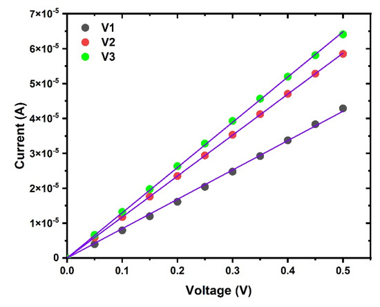 where I is the measured current, V is the applied voltage, β is the potential drop at the cathode and anode interfaces, e is the elementary charge of an electron, h is the plank’s constant, G/Go is the conductance parameter which is also equal to number of CFs at very low voltages, φ is the potential barrier height, and α is the parameter related to the potential barrier thickness (TB). Due to the asymmetry of the potential drop at the two ends of the CF, the β value is estimated to be 1. The presence of a potential barrier disrupting the CF is assumed in the HRS for all the three different types of devices V1, V2 and V3. A value of G/Go equal to 1 is assumed. According to Lian et al., in the case of low voltages and high enough potential barriers, Equation (1) converges as below [37]:
