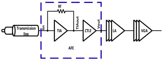 As data rates have increased by 1.5 times every year since 2000, high-speed data communications are required in modern broadband applications to address bandwidth demand. Initially, in 2000, radio frequency applications required a bandwidth of 1–2 GHz for optical time-domain reflectometer applications. To meet modern broadband demand, data rates have increased to 25~30 Gbps, which is more than 75% of previous data communications. Increasing bandwidth must meet multiple challenges including channel loss, high-speed operation, area, equalization, and robustness. For data communication power, in particular, consumption is a very important factor in maintaining high performance. There are several previous studies of 28 Gbps or higher data rates [,,,,]. Those use unrolled decision feedback equalizers to meet critical timing margins, but the unrolled CTLE structure increases the power and die’s area. To achieve these challenges, one of the key designs is an analog front-end (AFE) cascading transimpedance amplifier with a continuous-time linear equalizer.