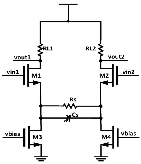 Receivers with equalization can overcome problems caused by channel loss, such as intersymbol interference. Effective high-performance receivers must meet numerous requirements, including those for power consumption, area, bit error rate (BER), and equalization. In receiver analog front-ends (AFEs), equalizers such as CTLE are commonly used (Figure 1). CTLE has lower power consumption than other equalizers in high-speed applications. Moreover, as the data rate increases, the proposed CTLE can achieve different equalization for different cable lengths by tuning the tail current with a fixed capacitor and resistor. The architecture presented in [] is generally used in high-speed AFEs.
