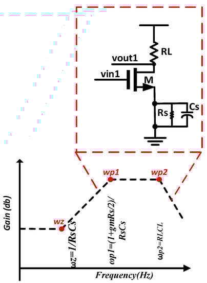 where = ,= = , = , = 2, , CL2 is the capacitance load, Lf is the inductance reactance, Rf is the feedback resistance, and RD is the load resistance. The transfer function comprises one dominant pole ωp2 and two high-frequency poles ωn and ωp1. To increase the gain, Rf should be larger. However, the RC constant can be increased by simply increasing Rf, unexpectedly decreasing the bandwidth [,]. Thus, inductance reactance is used to increase bandwidth without changing the pole ωp2.