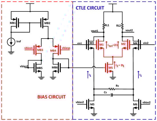 where Vcm is the common-mode voltage, and Vadjust is the adjusting voltage for varying the bias currents of the differential pairs of the CTLE. If Vbiasp > Vbiasn, the current I2 = 2I1 flows through M5, passes to M1 and M2, and the current I1 flowing through M6 and M7 passes to M3 and M4, as presented in Figure 4. The output current at nodes Vout1 and Vout2 is Itot = 2I1. Similarly, Vbiasp < Vbiasn; the output current at nodes Vout1 and Vout2 is Itot = 2I1. This design also boosts the DC gain at high frequency and slightly shifts the zero (ωz) and poles (ωp1 and ωp2). The zero ωz of the proposed CTLE is dependent on gm1 and gm3 and on RS and CS. The transfer function of the single-ended proposed CTLE is presented in Equation (8).