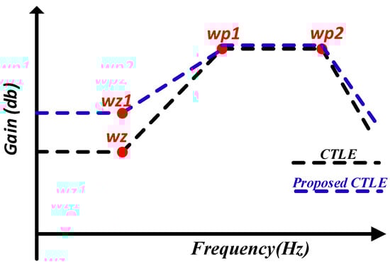 To attain the peak gain at a higher frequency, the CTLE must be designed such that the pole frequency is higher than the zero frequency [,,]. The peaking gain also depends on the dominant pole and zero. The frequencies depend on GM of the differential pair and of the degeneration CS and RS, as presented in Equation (2).