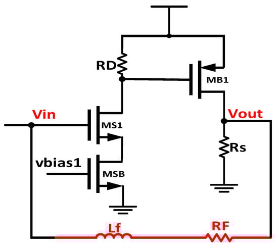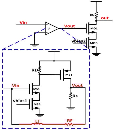 Figure 8 shows a single-ended TIA circuit with a common source stage and SF. The SF isolates RD from the loading effect of both Rf and Lf. The output impedance of the SF is less than the resistor feedback [,,].