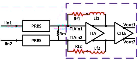 The AFE architecture presented in Figure 9 includes a differential Rm (100 Ω) termination, a two-stage CTLE and TIA, and a feedback resistor (Rf) and inductance reactance (Lf). The 100 Ω resistor was adopted to match the differential input of the circuit with that of the equipment. The AFE topology along the gm TIA with the CTLE compensates for the channel loss at a 15 GHz Nyquist frequency and adjusts the output amplitude without bandwidth deterioration [,,]. The transfer function of the AFE circuit is as follows: