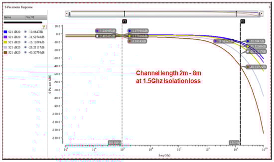 A high-frequency through-silicon scalable electrical model using a field solver was used as a transmission line (channel) [,]. Figure 10 reveals that the simulated channel can achieve 10 dB decay isolation loss at a 1.5 GHz Nyquist frequency for different cable lengths (2–8 m).