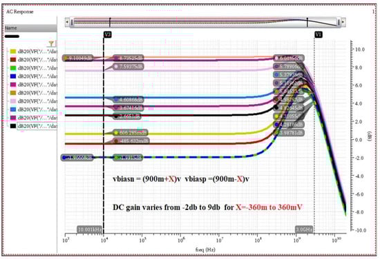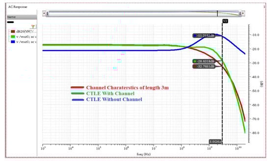 Figure 11 reveals that the simulated CTLE can achieve a DC gain of −2 to 9 dB at a 3 GHz Nyquist frequency by tuning bias voltage Vbiasn and Vbiasp and adjusting the voltage Vadjust (represented by X in Figure 11) from +360 to −360 mV for a channel length of 3 m. Figure 12 presents the characteristics of CTLE with and without a 3 m channel at a 3 GHz Nyquist frequency.