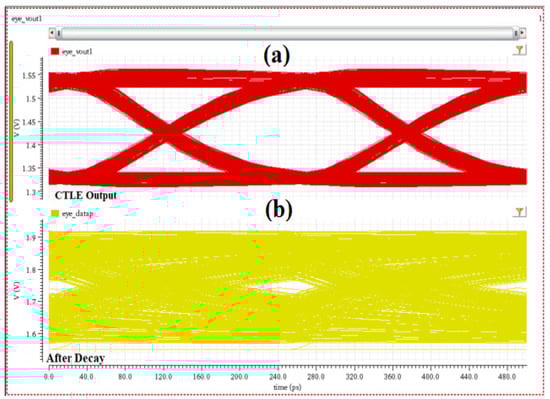 Figure 13 presents the simulated single-ended 6 Gb/s NRZ eye diagrams with the two different lossy channels. Figure 13b reveals that output eye is closed at the decay stage in which the CTLE is disabled. By contrast, Figure 13a reveals that the 6 Gb/s NRZ eyes are open if the CTLE is enabled.