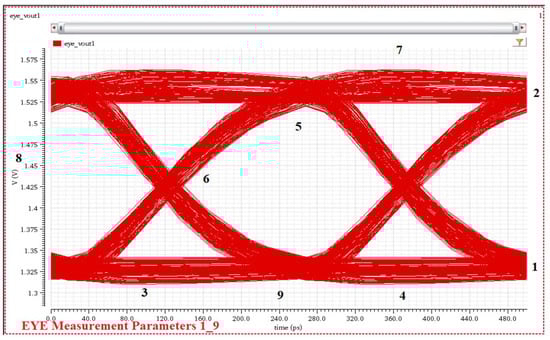 In this case, the input signal was a simulated NRZ pseudorandom bit sequence 231 − 1 with a peak-to-peak amplitude of 189.914 mV; the root-mean square jitter was 8.86 picosecond. An input and output impedance of 50 Ω and a 50 pf capacitor were used in this case. Figure 14 presents all measured parameters of the simulated eye diagram.