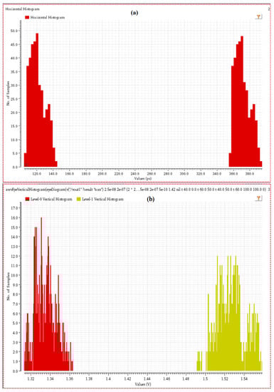 (a) Horizontal Histogram and (b) Vertical Histogram of eye diagrams for the 0 and 1 levels.