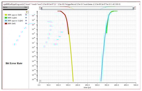 Simulated BER bathtub curves for NRZ input data rates of 6 Gb/s are presented in Figure 16. The BER variations for different positions of the sampling point for both time delay and the voltage–power relationship are presented in Figure 16. In this case, BER(t) was 0.16 × 10−12. Table 1 summarizes the key performance metrics of the proposed CTLE and other recently published CTLEs. The proposed CTLE achieved a peaking frequency with constant current for tuning its equalization competence.