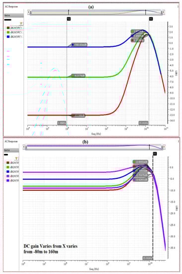 Simulated frequency response for the AFE. (a) 12 dB by tuning Vbias from −80, 0, and 80 mV and (b) from −80 to 160 mV.