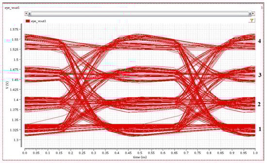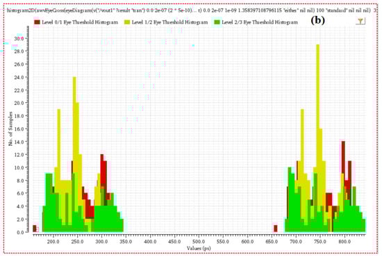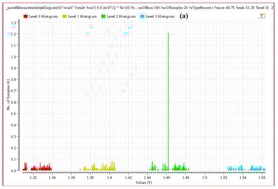 Figure 18 reveals that the simulated single-ended 30 Gb/s PAM4 eyes are open for 12 dB of channel loss at a 15 GHz Nyquist frequency. The PAM4 eyes parameters are indicated as (1)–(4) in the figure. The simulated 0-leVel (1), 1-leVel (2), 2-leVel (3), and 3-leVel (4) voltages were 1.325, 1.392, 1.463, and 1.544 V, respectively. The eye width of levels 0/1, 1/2, and 2/3 were all 375 ps. Figure 19a presents the width of a simulated level-4 eye using the histograms for the other levels. Similarly, Figure 19b presents the bit periods for level 0/1, 1/2, and 2/3 through threshold histograms.