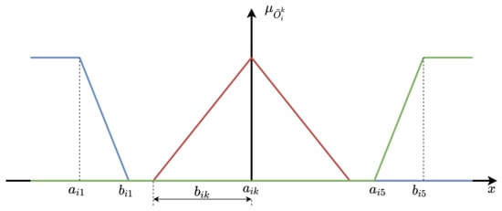 Membership functions are structured for  input linguistic variable  and  possible linguistic value . Their structure depends on the observed linguistic variable and its linguistic value. Equations (13)–(15) represent the membership function definitions for all the possible combinations of index values i and superscript values k. It can be seen that they are unit piecewise linear and defined using only two parameters,  and . Figure 3 gives a deeper insight into the membership functions and their parameters.