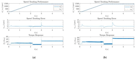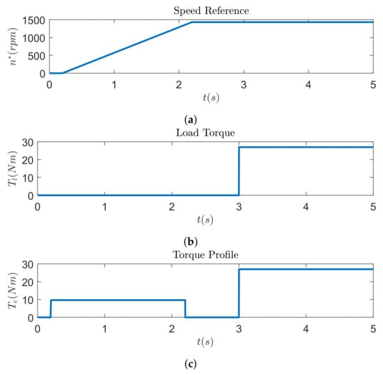 Simulated dynamics of a drive system are shown in Figure 5. It can be seen in Figure 5a that the speed reference is a function that is ramping from 0 to 1432.5 rpm during a 2 s period starting at 0.2 s of the simulation. Nominal load torque of 27 Nm is applied at the 3rd second of the simulation and it is constant till the end of the simulation, as can be seen from Figure 5b. Figure 5c represents the required machine torque profile calculated using Equation (24).
