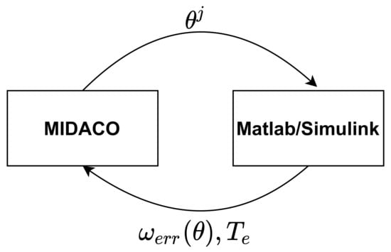 In this paper, the authors use the MIDACO solver, which stands for “Mixed Integer Distributed Ant Colony Optimization”, which is one of many metaheuristic methods for global optimum search, inspired by nature. It is chosen because it is easy to use and works well with a large number of decision variables and can also work in co-simulation with the Matlab environment. Out of the many settings that the solver offers, it only requires settings for decision variable limits and the start point of the search. Figure 6 represents the co-simulation between Matlab/Simulink and MIDACO that is executed to optimize the fuzzy controller parameters, where  represents the decision variable values of the current evaluation.