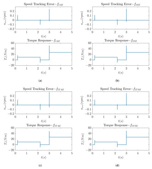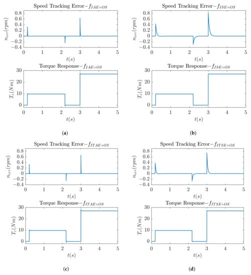 Speed tracking error and torque responses produced by: (a) Integral absolute error criterion with overshoot penalization. (b) Integral squared error criterion with overshoot penalization. (c) Integral time absolute error criterion with overshoot penalization. (d) Integral time squared error criterion with overshoot penalization.