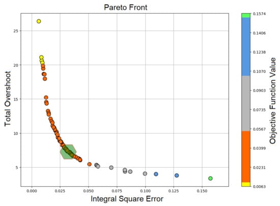 Depending on the application, a range of solutions are available to choose from, and they are represented by the circles in the graph. The green hexagon in the figure is the area of the Pareto front that the optimizer selected a solution from, and Figure 9 represents the system response produced by its parameters.