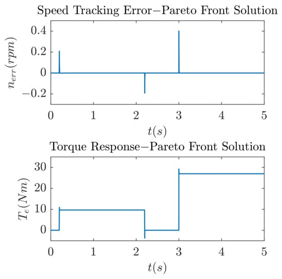 In this section, the optimization results, obtained by criteria from Equations (22), (25), and (26), are presented. Figure 7 shows the speed and torque responses that are obtained by using only criteria from Equation (22). It can be seen that the dynamics of the drive system have almost no impact on the speed response; in other words, the speed response has only around 0.2 rpm maximum tracking error and a fast settling time, but when observing the torque response, an unacceptable overshoot of around 20 Nm is observed. The reason for the large overshoot is the fact that the speed error is the only criterion for the optimization. To keep it at its lowest value, large control action is required at every instance when the speed diverges from the reference value. Since there is no criterion that would limit or penalize the torque, optimized parameters allow this kind of behavior. An attempt is made to remedy this problem with a multi-objective optimization approach. The first objective is selected as  from Equation (22) and the second as overshoot from Equation (25). Figure 8 represents the optimization result in the form of a Pareto front, where the x-axis represents the  value and the y-axis represents the total overshoot value.