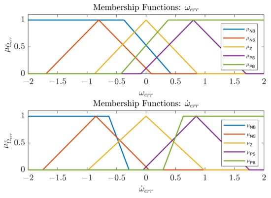 Input variables to the fuzzy controller are chosen to be the speed tracking error  and its derivative , while the output is defined as fuzzy error . All relevant vectors and sets that will be used are: real valued input vector , input linguistic variable vector , and input linguistic value sets , where i represents the input ordinal number. Regarding the output,  represents the real valued output vector,  represents the output linguistic variable vector, and  represents the output linguistic value set. Established vectors and sets are defined as follows:
