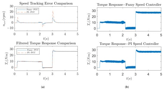 System response comparison between proposed method and classic PCC method. (a) Speed tracking error and filtered torque response. (b) Unfiltered torque response.