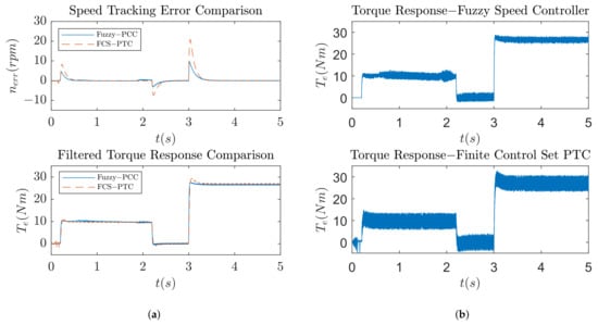 In this section, a full simulation with the drive, inverter, and observer is evaluated. Control parameters used for the fuzzy controller are the ones obtained by the  criterion in the optimization procedure. A block diagram of the simulated control method is shown in the Figure 1. From the Figure 12a it can be seen that optimized controller parameters produce great speed tracking with maximum tracking error of only 2 rpm, but still produce large torque overshoot at the loading instance. By reducing the proportional and integral gain of the fuzzy logic controller, it is possible to adjust the response and remedy this problem. Figure 12b shows the performance of the system with reduced gains—in this case,  and . It can be seen that the torque overshoot is greatly improved, while the speed response is slightly affected, but the system still offers a small maximum tracking error of around 10 rpm. In the following section, a comparison with several conventional model predictive control methods will be performed.