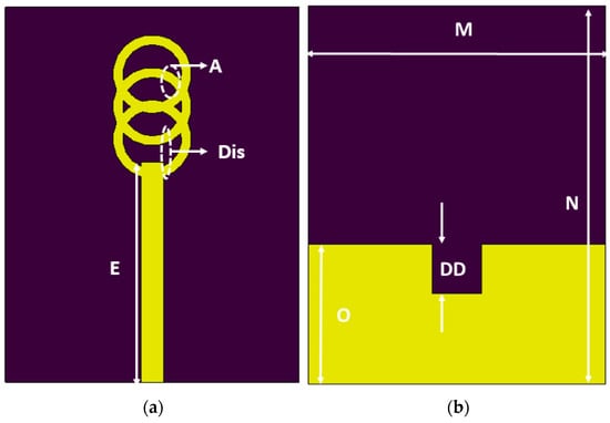 The proposed multi circular loop ring mm-wave antenna is designed on an ultra-thin Ro5880 substrate, with a relative permittivity of 2.3. The substrate is 0.254 mm in height. Figure 1 shows the proposed antenna’s front and back view. The dimensions of the proposed antenna in mm are as follows: A = 0.3, E = 6.75, M = 9, N = 11.5, DD = 1, O = 4.75. The wide bandwidth characteristic of the proposed antenna is achieved using several numbers of the conducted parametrical studies. These studies included ring interspacing, transmission line feed modeling, and square slot on the ground plane. Figure 2 shows the overall response of the parametrical studies.