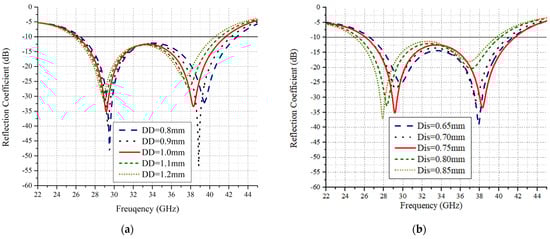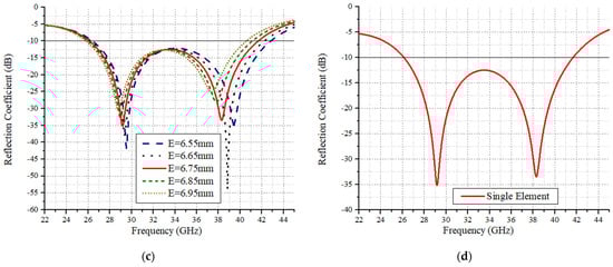 As observed in Figure 2a, the parameter DD has a significant impact on the resonance response attained. The ground slot parametrical studies were conducted with a 0.1 mm apart value. As shown, at 0.8 mm, the antenna showed resonance from 27 to 42.6 GHz, while for 0.9 mm, the bandwidth ranged from 26.7 to 42.0 GHz. The optimum response was attained at a 1 mm ground slot value, exhibiting bandwidth characteristics from 26 to 41 GHz. It was observed that the ground slot affects higher frequency. In addition, the reflection coefficient response overall moves to lower values. Next, the parametric response concerning the distance between the circular loops is analyzed. The distance impact is analyzed at a 0.1 mm value. As observed in Figure 2b, the lower frequency range is affected by the starting values of 0.65 and 0.7 mm. The optimum response was achieved at 0.75 mm, as after this value, the reflection coefficient response is degraded. Figure 2c shows the feed line modeling effect for the proposed structure. As observed in Figure 2c, at the initial value of 6.55 mm, the resonance response stretches up to 42 GHz but the starting frequency response also moves forward. With the gradual increase of 0.05 mm, the resonance response moved backwards and the optimum response was achieved at 6.75 mm. Figure 2d shows the single element reflection coefficient obtained.