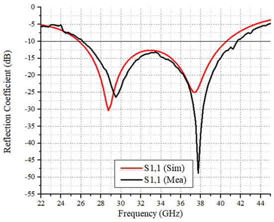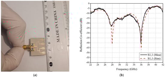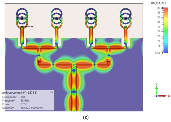 The proposed design is transformed into a four-element linear array to achieve high gain characteristics. The array is shown in Figure 5. As observed in the figure, the array total length and width are 18.5 × 22.5 mm, respectively. The ground plane length is kept at 12.5 mm. The feed network is composed of a 50 Ω feed line, divided into a 100 Ω feedline, which is further subdivided into 70.7 Ω. The end feedlines connecting each radiating elements are 100 Ω feed lines. The widths of the feedlines are as follows: 50 Ω = 0.7 mm, 100 Ω = 0.28 mm and 70.7 Ω = 0.36 mm. Figure 5c shows the surface current distributions of the feed network at 28 GHz. As observed, the array network distributes power equally among the radiating elements. Figure 6 shows the simulated and measured reflection coefficient response of the proposed four-element array system. From the figure, it is clear that the simulated and measured results are in good agreement. The minute disruptions are the result of fabrication and measurement errors.