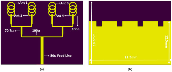 With the evolution of communication systems in modern telecommunication infrastructure, 5G is standardized throughout the world, offering high channel capacity characteristics with an increased number of users connected and low latency over the communication channel [,,,]. The 5G spectrum is categorized into two broad regions as Sub6 GHz, ranging under 6 GHz frequency, and mm-wave region, in which frequencies above 24 GHz and above are adopted. The bands of 28 GHz and 37 GHz and 39 GHz are licensed mm-wave bands in the mm-wave spectrum, for which in order to overcome high attenuation and propagation losses, high gain antenna arrays are required [,,,]. These antenna arrays include higher numbers of radiating elements with low-loss feeding networks [,]. There are several antenna systems reported in the literature [,,,,,,]. These antenna systems include substrate integrated waveguide (SIW) antenna systems, air filled gap structures (AFGs), and planar structures. In [], a multilayer antenna array with wideband and high gain characteristics is presented. The frequency range of the reported antenna is 57–71 GHz, with a peak gain of 13.9 dBi and minute sidelobe levels, with the number of Vias included. However, due to the nature of bonding films and asymmetric Vias inside SIW, the reported structure is complex to build and integrate into RF circuits. Waveguide antennas usually accomplish high gain, but the large volume of the metallic waveguide with a high manufacturing price is the main hitch for bulk production. In [], an 8 × 8 element SIW array is presented with a bandwidth range from 35.4–41.7 GHz, total peak radiation efficiency of 82% and realized gain of 26.1 dBi. The array is difficult to assemble due to the higher numbers of Vias included. Planar antenna arrays are simple to assemble compared to SIWs. The transmission line losses are high compared to SIW, but they can be neglected with careful feed network modeling. A four-element T shape planar antenna array is presented in []. The peak gain achieved is 11.5 dBi and the bandwidth attained is 8 GHz, approximately. A modified four-element hook shape antenna array in [] exhibited a dual-beam radiation response, with a small angular beamwidth of twenty-four Degree. A four-element planar antenna in [] shows a dual-band response at the central frequency of 28 GHz and 38 GHz. The reported antenna showed a peak gain of 7 dBi, but the bandwidth at both resonances is extremely low. Metamaterial-induced mm-wave antennas have also been reported, but they are difficult to assemble and the cost and complexity generally increase [,].