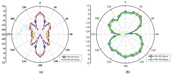 The performance parameters of the proposed antenna array are shown in Figure 7. The radiation efficiency throughout the band of interest is above 89% and the measured efficiency is above 84%. At 28 GHz, the radiation and total efficiency is 94% and 93%, respectively. The gain of the proposed array ranges from 9 dBi to 11.5 dBi. The gain of the antenna array becomes low at the higher frequency end. The simulated gain of the array at 28 GHz is 10.7 dBi and the measured gain is 10.5 dBi. The peak gain achieved is 11.5 dB at 30.5 GHz. Figure 8 shows the proposed antenna array radiation patterns at 28 GHz resonance. The patterns show the far-field characteristics for Phi 90 and Phi = 0. As observed in the figure, the array exhibits a dual-beam characteristic with a very narrow beamwidth, as required for mm-wave systems. The simulated and measured radiation patterns are in good agreement. Figure 9 shows the 3D antenna radiation pattern of the 28 GHz system.