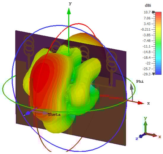 Similarly, Ref. [] presents a single element with a super bandwidth operating from 6.5 to 100 GHz. The proposed antenna offers stable radiation patterns at lower resonance frequencies but at higher frequencies, the radiation patterns deviate. The size of the antenna is 20 × 20 mm2 only while the maximum gain achieved is 10 dB.