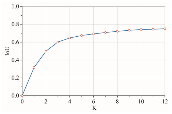 | where box refers to the size of the rectangular box; cen refers to the center of the rectangular box; IoU is the intersection over union of two rectangular boxes. (3) Repeat step (2) until the K clustering centers are selected; (4) Calculate the distance to the K cluster centers for each sample in the training set and divide it into the class corresponding to the clustering center with the smallest distance; (5) Recalculate the clustering centers according to the division results according to Equation (5); | |