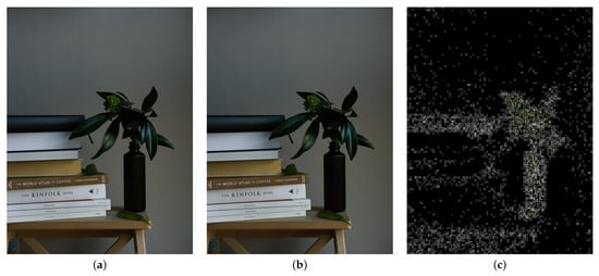 (a) Clean image, (b) image with data hidden using UERD algorithm, and (c) differential image between them, scaled 100 times. Density of steganographic data: 0.4 bpnzac, which means here 2638 B of hidden data in each 53 kB image file. Clean image source: unsplash.com (accessed on 8 April 2022).