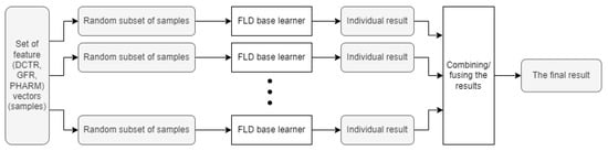 The base component of the shallow classifier is the ensemble classifier based on the FLD model []. A diagram presenting the way the ensemble classifier operates is shown in Figure 2. The set of feature vectors created by extracting DCTR, GFR, or PHARM characteristics from pictures is used to generate smaller subsets through a random selection of samples from the original set (a process called bootstrapping). These subsets are then used to train individual base learners independently from each other to diversify their classification logic. Throughout the training process, the size of the subset and the population of the ensemble (the number of base learners) is adjusted to minimize the out-of-bag error of the system. These subsets are then used to train individual base learners. Upon testing, each base learner reaches its decision independently of others and the results from the whole “population” are aggregated to produce a single decision.