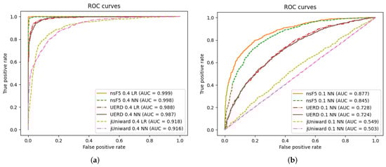 Comparison of ROC curves for the best neural network and the best ensemble classifier for data hidden (a) with density 0.4 bpnzac and (b) with density 0.1 bpnzac.