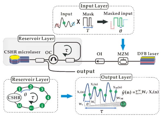 In the input layer, the input signal is sampled, and the holding time of each sampling point is T. The modulation signal is obtained by multiplying the input signal after sampling and holding with the mask signal, whose period is T and remains constant in the interval θ. In this paper, T was set to be consistent with τ. We used a chaos mask to improve the performance of the RC system. Previous research has shown that the use of a chaotic mask signal is prone to causing complex behavior in response to the laser output [,]. In the reservoir layer, a nonlinear conversion was performed on the input signal, and nonlinearity between the input and high-dimensional state space was realized. The DFB laser was used as the input light source, and the CSHR microlaser with a delay loop was used as the reservoir. τ = M × θ is the feedback delay time, where the number of virtual nodes is M, and the interval between two adjacent virtual nodes is θ. The Rinf is the reciprocal of τ [].