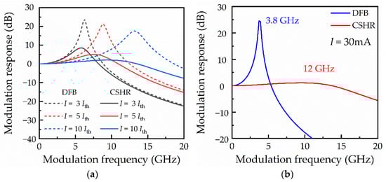 The Lang–Kobayashi equation is usually used to study the characteristics of DFB lasers. In addition to the aforementioned differences, we also use the modulation characteristic curve to further analyze the differences in the output characteristics of the two lasers by adding a sinusoidal current to the laser for modulation. The values of the DFB parameters are referred to in Reference []. As shown in Figure 2a, the small signal modulation response curves of the DFB laser and CSHR microlaser under different bias currents are studied, where the dashed line represents the case of the DFB laser, and the solid line represents the CSHR microlaser.
