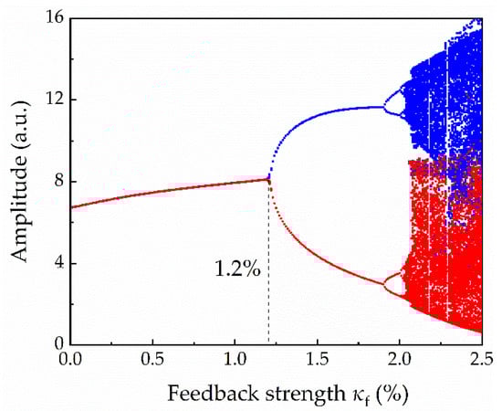 To achieve a better performance in the RC system, the reservoir should operate in a stable regime, but not too far from the bifurcation point []. Figure 3 depicts the transition of different dynamic states of the CSHR microlaser with the continuous increase in κf. The blue and red points represent the maximum and minimum values in the time series waveform output by the CSHR microlaser under optical feedback, respectively. It can be seen from the figure that when κf is less than 1.2%, the blue and the red points basically coincide, which means the laser is working in a stable state at this time. With the increase in κf, period, period-doubling and a chaotic state appear, so κf = 1.2% is the Hopf bifurcation point of the laser dynamics.