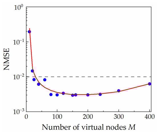 In the RC system, the size of virtual node M plays an important role. When M is small, it is difficult to handle complex tasks due to the low dimensions of the RC. If τ is increased when θ is fixed, although M can be increased, Rinf will be decreased. In order to describe the influence of M on the RC system more intuitively and find a suitable value for M, we carried out the analysis shown in Figure 4. In the figure, Δν = −25 GHz, κinj = 0.4, κf = 1%, the dashed line represents the case of NMSE = 0.01, where τ is fixed at 0.1 ns, namely the Rinf of the system is 10 Gbps. As a result, the NMSE is above the dashed line when M is lower than 20. This is due to the insufficient coupling between virtual nodes caused by too large a θ and reduces system performance. With the increase in M, the prediction performance of the system gradually improves, but when M increases to 160, the NMSE does not decrease but shows an upward trend. The reason for this phenomenon is that under a smaller θ, there is too much averaging between nodes [].