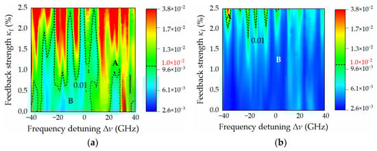 One possible reason for this phenomenon, exhibited in Figure 5a,b, is that the response laser exhibits complete injection locking behavior in all considered Δν ranges when κf is small. As κf increases, three typical injection locking behaviors gradually appear: fully locked, partially locked and unlocked. This results in a change in the dynamics of the response laser, which further affects the performance of the RC system. In addition, a comparison of the two figures shows that the strong injection expands the range of Δν and κf to achieve a better prediction performance. Furthermore, it is evident from Figure 5a that this has asymmetry, which is caused by the usual symmetry of injection locking in semiconductor lasers with a larger linewidth enhancement factor.