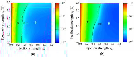 According to the richness and effects in Figure 5, Δν was selected as −25 GHz and 25 GHz in the following analysis. Figure 6 analyzes the dependence of the predicted performance of the RC system on κinj and κf. The figure is divided into two regions by the dashed line, which indicates the case of NMSE = 0.01, where the area B corresponds to NMSE ≤ 0.01 and the remaining part is area A. In this analysis, the main parameters were set as I = 12 Ith, M = 25 and τ = 0.1 ns. When κinj is close to 0, the value of NMSE is around 1, which means that the RC system has little predictive effect. In Figure 6a, when κf ≤ 1.2%, the dashed line of NMSE = 0.01 is almost parallel to the vertical axis, and with the further increase in κf, the dashed line is obviously inclined. The left side of the figure belongs to region A, where κinj ≤ 0.32. The area of region B gradually increases in the considered range of κf when κinj varies from 0.32 to 0.51. NMSEs fully belong to region B in κinj between 0.51 and 1.2. In general, the area of region B is larger than that of region A, which means that a good prediction performance occupies a larger range. In Figure 6b, Δν is 25 GHz, which obtains a similar trend to that in Figure 6a but reduces the area where the system predicts a better performance. It can be seen from the figure that when κinj ≤ 0.4, the NMSE is basically less than 0.01. The prediction performance of the system improves with the increase in κinj. In terms of color, the regions with a better prediction performance are concentrated between a κf of 1% and 2%. Both figures show that with the increasing κf, the NMSE shows an upward trend. This means that a larger κinj and a smaller κf help to improve the prediction performance of the RC system.