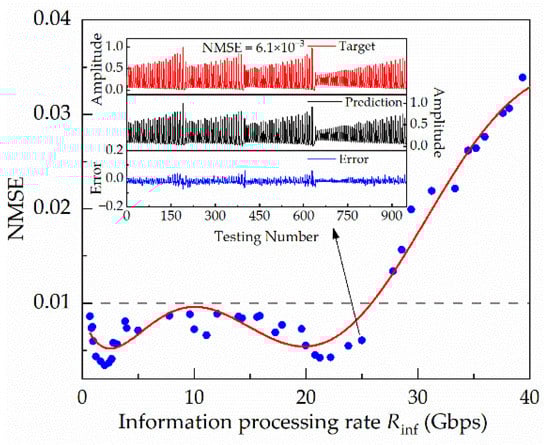 The Rinf has always been a concern in RC systems, so we analyzed its impact on the RC system, as shown in Figure 7. The dashed line indicates the case of NMSE = 0.01. Considering the further development of technology, we can more easily obtain a smaller θ without being restricted by existing equipment, which will help to reach a much higher Rinf. In Figure 7, a different τ is obtained by changing θ under an M fixed at 25. The lowest NMSE = 3.4 × 10−3 is obtained when Rinf is 2 Gbps. Meanwhile, the value of NMSE fluctuates in the range of 3.4 × 10−3 to 1 × 10−2 when Rinf is in the range below 25 Gbps. The reason for this phenomenon may be due to the coupling and averaging effects between nodes due to noise and θ. It is worth noting that the NMSE can still be lower than 0.01 when θ is 1.6 ps and Rinf reaches 25 Gbps. To more intuitively depict the prediction performance of the RC, we selected a higher Rinf of 25 Gbps and compared the predicted value with the target value, as shown in the inset. The NMSE is 6.1 × 10−3, the predicted value almost coincides with the target value, and the error between the two is no more than 0.2. Therefore, the system exhibits unique advantages in high-speed information processing.