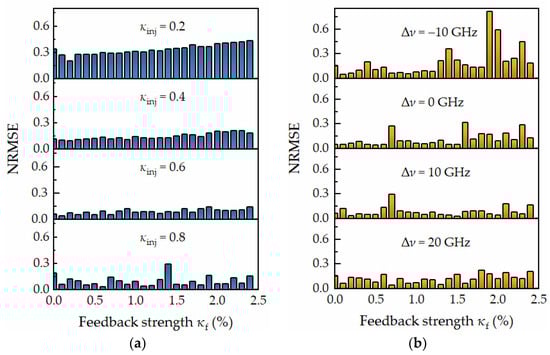 As in the above text, we analyze the dependence of the performance of the RC system on the κinj and ∆ν. Figure 8a,b illustrate the distributions of NRMSE under different κinj and ∆ν within the range of κf from 0 to 2.5% (interval is 0.1%), respectively.