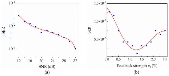 (a) The SER as a function of SNR; (b) The SER as a function of feedback strength κf; with I = 12 Ith, κinj = 0.8, Δν = −25 GHz and M = 50.