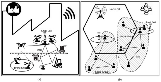 5G D2D is recently receiving more interest as a critical technology promoting the industrial 4.0 paradigm and many daily life applications with situation-adapted intelligence since D2D is able to support machine-type communication, flexible/extensible connectivity to the Internet, and temporal dynamic inter-connectivity. Figure 1 presents those scenarios with D2D and other 5G connectivity techniques. Particularly, Figure 1a illustrates the smart factory scenario with various IoT devices such as drones, autonomous mobile robots, and producing robots which can be connected via a range of the 5G connectivity techniques such as small cells, D2D, and Drone-supported communication [9]. Then, D2D takes the role to inter-connect among diverse cells as well. In the other case, social networking is configured through the D2D technique, as shown in Figure 1b, where two social groups are formed via D2D. It means that the members of each group might be willing to open their own smart mobile device capacity to other members since D2D relies on sharing resources of devices in communication, which is the biggest reason to prevent this novel paradigm deployment nowadays [5,6].