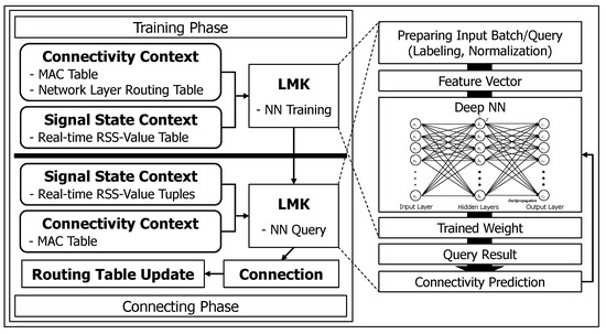 The designed light-weight multi-layer neural network, denoted by LMK, is based on k numbers of nodes in the input layer, hidden layers, and output layer. The number k indicates the maximum number of the MAC layer links and the hidden layers use minimum numbers of k nodes in LMK. LMK uses the Sigmoid function as the activity function, and then error backpropagation is calculated at the output and distributed back through the network layers. In order to reduce computing overhead, LMK does not exploit the convolutional layer and the SoftMax function. When the input data is prepared, the connectivity context and signal state context are utilized to make the label for training data, and the prepared input batch is normalized. LMK carries out the training of data. During the training, the error against the label is propagated backward. After multiple numbers of epochs, LMK can be ready to receive queries with the trained weight of its own neural network. Then, a query can be conducted in LMK by preparing a data set with real-time RSS values and current MAC layer links. LMK provides query in the trained NN and decides on connecting paths as the prediction result.