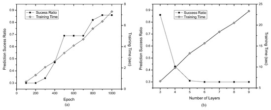 Comparison of Prediction Success Ratio: (a) Numbers of Epochs and (b) Numbers of DNN Layers.