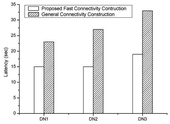 Figure 4 shows the comparison results for latency. The latency time of DN1, DN2, and DN3 for the proposed scheme is 15, 15, and 19, respectively. For the general connectivity scheme, the latency time of DN1, DN2, and DN3 are 23, 27, and 33, respectively. According to the results, the smartphone can maintain the network connection over the best MAC link to the DNs with low latency even though it is continuously moving. On average, the latency of the proposed scheme in terms of connectivity reconstruction is 11.3 s faster than general connectivity construction.